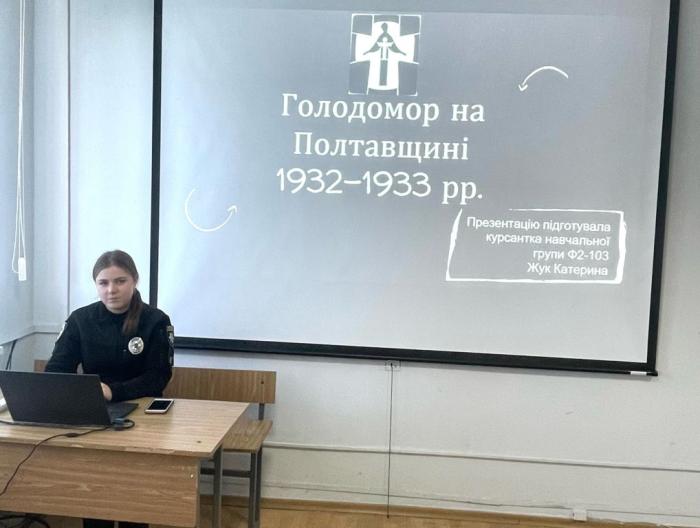 Під головуванням завідувача кафедри українознавства факультету № 2 доктора філологічних наук, професора Ігоря Чорного відбулося засідання кафедрального наукового гуртка, присвячене 90-м роковинам Голодомору 1932-1933 років. Захід проводився у формі круглого столу. Курсанти зачитали наукові доповіді, супроводжуючи їх відеопрезентаціями. Висвітлювалося багато аспектів, пов’язаних із цими трагічними сторінками вітчизняної історії: особливості Голодомору у різних областях України, відображення подій в художній літературі та мистецтві тощо. Доповіді викликали зацікавленість в аудиторії, супроводжувалися жвавими дискусіями, під час яких неодноразово лунали думки, що сучасному суспільству треба пам’ятати як героїчне, так і трагічне минуле свого народу. Достеменно невідомо, скільки українців загинуло за часів Голодомору. Нелегко гортати чорну хроніку Голодомору 1932-1933 років, але без повної правди про минуле, якою б страшною вона не була, неможливий процес оновлення та очищення, який відбувається сьогодні в Україні.