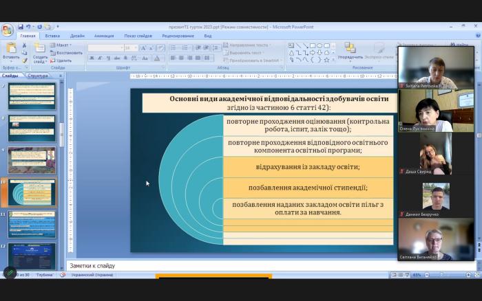 Завідувачка кафедри, кандидатка економічних наук, доцентка Олена Лук’янихіна провела бесіду на тему «Підготовка наукової доповіді: принципи академічної доброчесності, ресурси, методи пошуку інформації». Вона ознайомила присутніх з основними документами Сумської філії ХНУВС, що містять політику, стандарти і процедури дотримання академічної доброчесності, розповіла про сутність, основні види порушень академічної доброчесності та відповідальність відповідно до чинного законодавства як науково-педагогічних працівників, так і здобувачів вищої освіти. Наголошено було також на необхідності дотримання доброчесної поведінки в межах освітнього процесу і наукової діяльності. Завідувачка кафедри продемонструвала учасникам основні наукові ресурси і методи пошуку інформації для підготовки наукового повідомлення, розповіла гуртківцям про Нобелівську лауреатку 2023 року у галузі економічних наук Клаудію Голдін, яка отримала премію «за поглиблення розуміння позицій жінок на ринку праці».