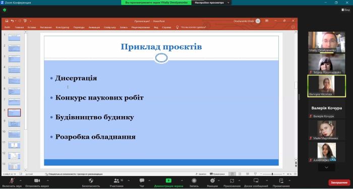 Віталій Омельяненко, маючи багатократний досвід керівництва грантовими проєктами, фінансованими міжнародними організаціями та Міністерством освіти і науки України, висвітлив основні характеристики сучасних проєктів, особливості індустрії 4.0 та необхідність формування навичок для здійснення проєктної діяльності, презентував трикутник управління проєктами, а також особливості побудови «дерева проблем» та «дерева цілей».