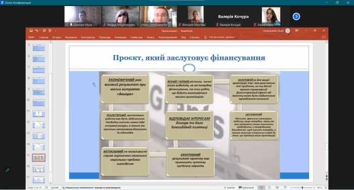 Разом зі здобувачами вищої освіти науковці обговорили важливі риси, притаманні проєктам, що першочергово заслуговують на фінансування, класифікацію донорів й основні характеристики грантових конкурсів, актуальність тем досліджень, зокрема тих, що стосуються сталого розвитку та повоєнної відбудови нашої держави.