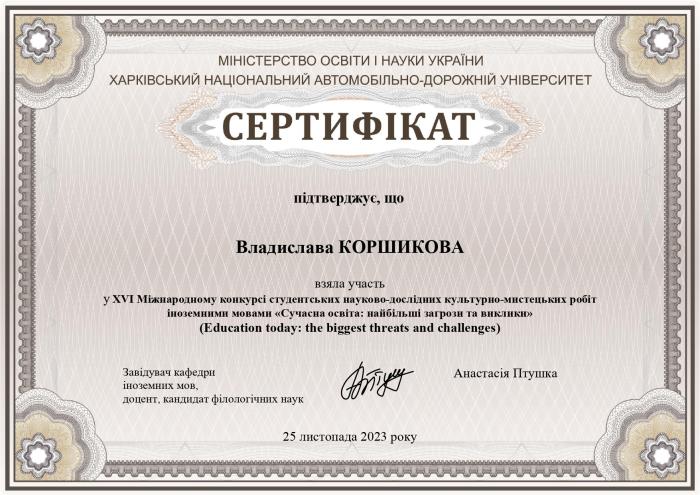 Сертифікат учасника отримала курсантка 3 курсу факультету №4 Владислава Коршикова, яка представила на конкурс роботу “Education of Internal Displaced Persons in Ukraine, and Some Other Problems” (науковий керівник - доцент кафедри іноземних мов факультету №4 Олег Гончарук).