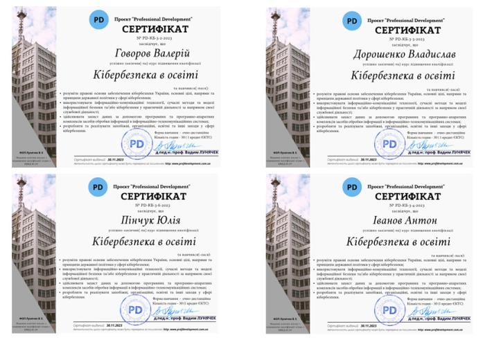 Представники кафедри правоохоронної діяльності та поліціїстики факультету № 6 ХНУВС Ірина Панова, Валерій Говоров, Владислав Дорошенко, Юлія Пінчук та Антон Іванов під час курсу набули навичок використання інформаційно-комунікаційних технологій, оволоділи сучасними методами та моделями інформаційної безпеки в сфері освіти, опанували основи захисту даних в інформаційно-телекомунікаційних системах закладів освіти.