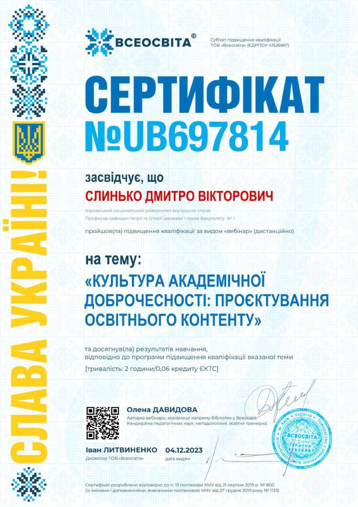 Професор кафедри теорії та історії держави і права факультету № 1 Харківського національного університету внутрішніх справ Дмитро Слинько взяв участь у вебінарі «Культура академічної доброчесності: проєктування освітнього контенту», що відбувся на Національній освітній платформі «Всеосвіта».