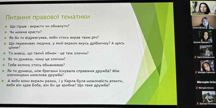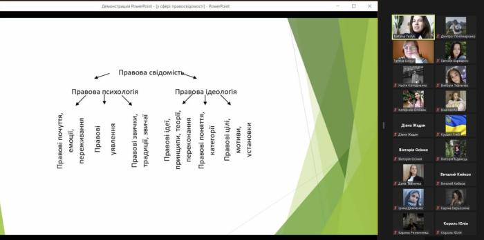 Спільно зі студентами обговорили джерела та природу правової культури, процес формування правової свідомості. Здобувачі освіти поділилися власним досвідом та уявленнями про правову дійсність, дотримання правових норм, необхідність правового регулювання суспільного життя. Спікери проаналізували правову свідомість, яка виступає не тільки механізмом впливу на людину і суспільство, а й є станом позитивної взаємодії останніх.