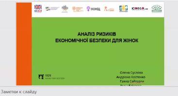 Протягом зустрічі консультантки Інформаційно-консультативного жіночого центру (ІКЖЦ) презентували результати масштабного дослідження «Аналіз ризиків економічної безпеки для жінок». Його головна мета – визначення факторів, які допомагають жінкам долати економічні негаразди, зокрема з числа вразливих груп у 14 областях нашої країни із подальшою розробкою рекомендацій для органів влади, міжнародних організацій та громадських організацій.
