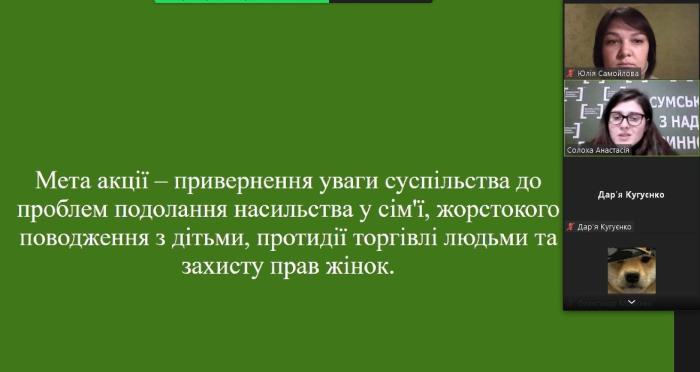 У межах проведення Всеукраїнської акції «16 днів проти насильства» викладачі кафедри гуманітарних дисциплін Сумської філії ХНУВС проводять заходи для кураторських груп із метою підвищення рівня обізнаності здобувачів освіти щодо усіх форм та дій у разі виявлення фактів здійснення тієї чи іншої форми насильства.