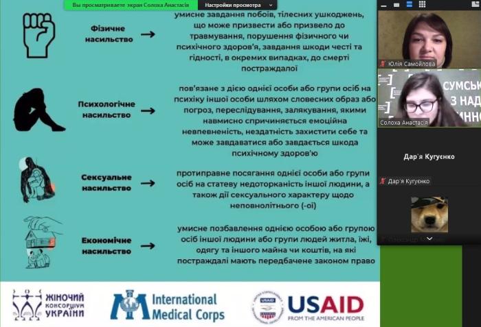 Кураторка групи Юлія Самойлова спільно з головною юристкою Сумського місцевого центру з надання безоплатної вторинної правової допомоги (БВПД) Анастасією Солохою провела для здобувачів 2 курсу спеціальності «Правоохоронна діяльність» онлайн-лекцію на тему «Правові засади протидії ґендерно зумовленому насильству». Анастасія Солоха ознайомила з основними видами насильства, як вони проявляються та розповіла, як допомогти людині в тій чи іншій ситуації. Увагу студентів було акцентовано увагу на тому, що ґендерно зумовлене насильство є одним із найбільш небезпечних проявів насильства. Воно часто залишається непоміченим, невирішеним та неконтрольованим.
