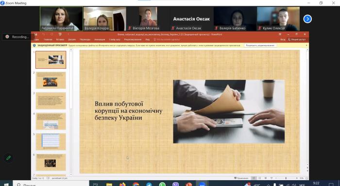 Доповіді, презентовані студентами, були цікавими й інформативними, а обрані теми – актуальними, оскільки в них було висвітлено місце і роль побутової корупції в загальній корупційній системі, її вплив на економічну безпеку України, а також розглянуто було особливості протидії корупції в Україні в умовах воєнного стану.