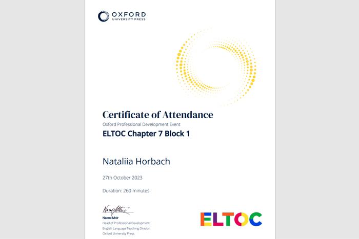 Старша викладачка цієї кафедри Наталія Горбач взяла участь у дводенній онлайн-конференції «ELTOC Chapter 7 Block 1» від Oxford University Press. На заході розглядалися найактуальніші теми у викладанні англійської мови та можливості доступу до високоякісного професійного розвитку під керівництвом експертів.