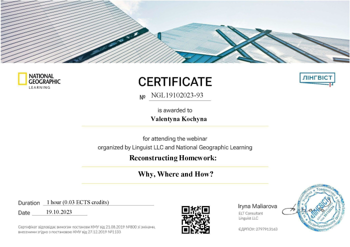 Доцентка кафедри іноземних мов факультету № 4 ХНУВС Валентина Кочина відвідала Міжнародний онлайн-вебінар «Reconstructing Homework: Why, Where and How?» від Linguist LLC and National Geographic Learning. На ньому розглядалися питання пошуку нових ідей та підходів до організації самостійних завдань у процесі вивчення англійської мови, створення практичних завдань, які сприяють осмисленню та поглибленню мовних навичок. Викладачка дізналася, як перетворити домашні завдання на виклик, що мотивує до самостійного навчання, та як побудувати систему оцінювання й зворотного зв’язку.