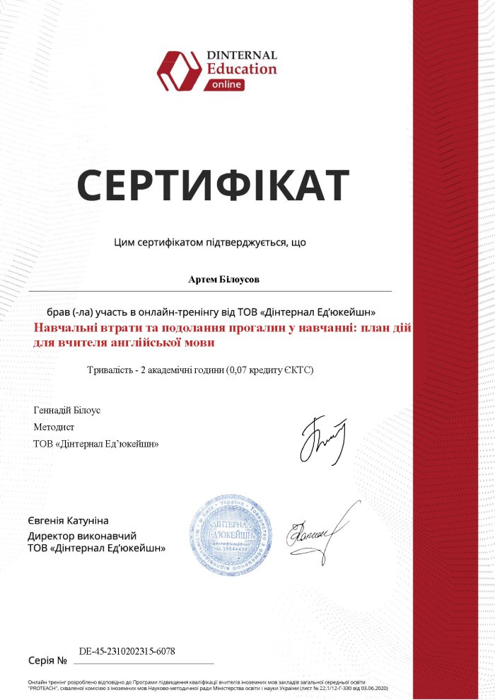 Старший викладач цієї ж кафедри Артем Білоусов відвідав онлайн-тренінг «Навчальні втрати та подолання прогалин у навчанні: план дій для вчителя англійської мови» від ТОВ «Дінтернал Ед’юкейшн», на якому розглядалися питання створення сприятливого навчального середовища для вивчення іноземної мови, методи якісного визначення рівня проблеми (навчальних втрат) на початку навчального року, варіанти співпраці задля подолання проблеми, види роботи, що допоможуть спланувати подальшу роботу над прогалинами у навчанні. Викладач навчився визначати рівень навчальних втрат на початку навчального року, створювати сприятливе навчальне середовище, співпрацювати над подоланням проблем у навчанні та інтегрувати в загальний навчальний процес види роботи, що сприятимуть подоланню прогалин у навчанні.