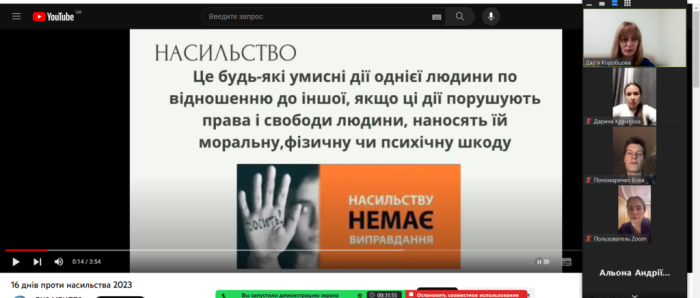 Доцентка кафедри правового забезпечення підприємницької діяльності та фінансової безпеки факультету № 6 Дар’я Коробцова провела онлайн-зустріч з кураторською групою на тему «Мій улюблений світ – без насильства», приурочену Всеукраїнській акції «16 днів проти насильства».