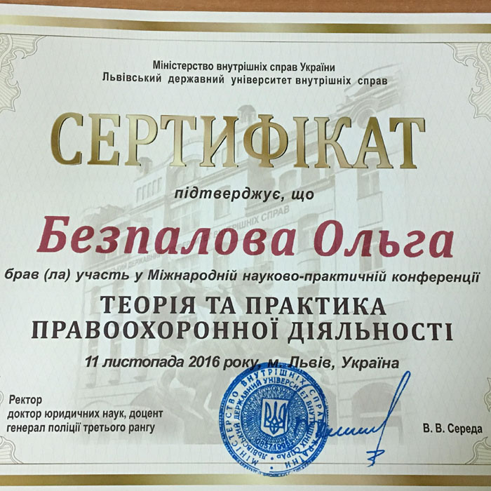 У Львові відбулася Міжнародна науково-практична конференція «Теорія і практика правоохоронної діяльності». До участі у конференції були запрошені фахівці вищих навчальних закладів Угорщини (Національного університету державної служби), Республіки Польща (Вищої школи безпеки та Вищої школи поліції), представники Консультативної Місії Європейського Союзу в Україні, представники Національного антикорупційного бюро України, Головного управління Національної поліції у Львівській області, прокуратури, апеляційних адміністративних, районних судів. Тези своїх доповідей надали понад 150 науковців вищих навчальних закладів України. Харківський національний університет внутрішніх справ на конференції представила завідувач кафедри адміністративної діяльності поліції, доктор юридичних наук, професор, підполковник поліції Ольга Безпалова.