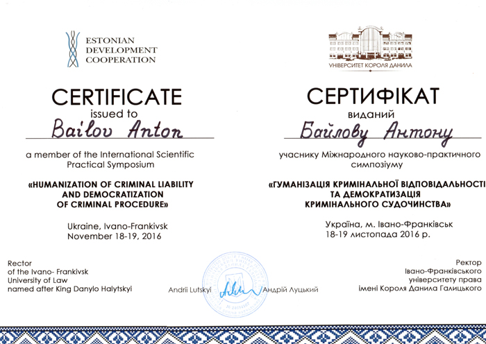 Представник університету професор кафедри кримінального права і кримінології факультету № 1 Антон Байлов взяв участь у Міжнародному науково-практичному симпозіумі «Гуманізація кримінальної відповідальності та демократизація кримінального судочинства», організаторами якого виступили Івано-Франківський університет права іменіКороля Данила Галицького спільно з Міністерством закордонних справ Естонської Республіки та посольством Естонії в Україні. Партнерами заходу були Талліннський університет і Юридичний факультет Талліннського технологічного університету.