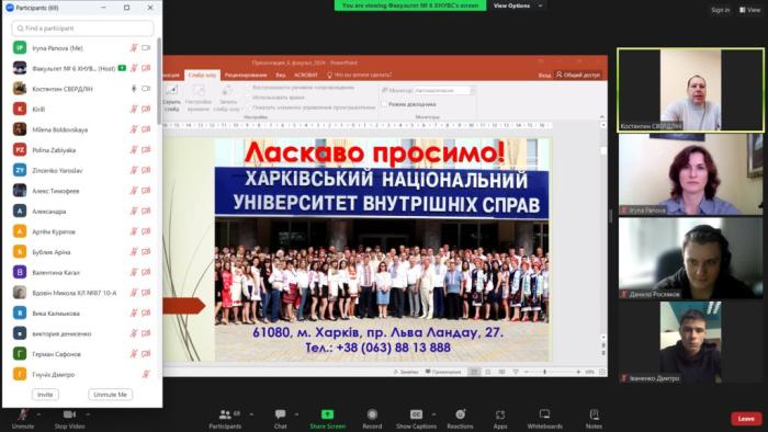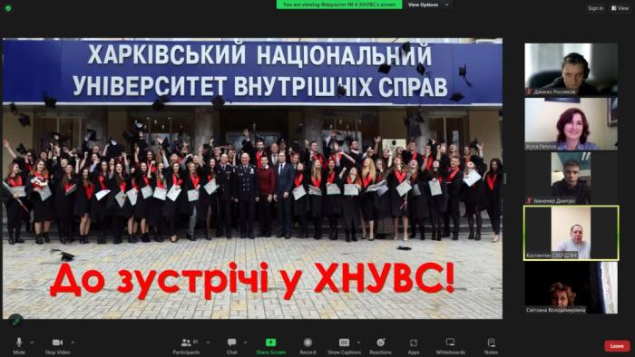 Учасникам зустрічі представили демонстраційні слайди про факультети та спеціальності, за якими здійснюється підготовка фахівців у ХНУВС, розповіли про переваги навчання у Харківському поліцейському виші, зокрема про особливості навчання на факультеті № 6, роз’яснили правила вступу до університету, ознайомили з роботою підготовчого відділення, діяльністю кафедри військової підготовки. Було продемонстровано відеоролик про університет.