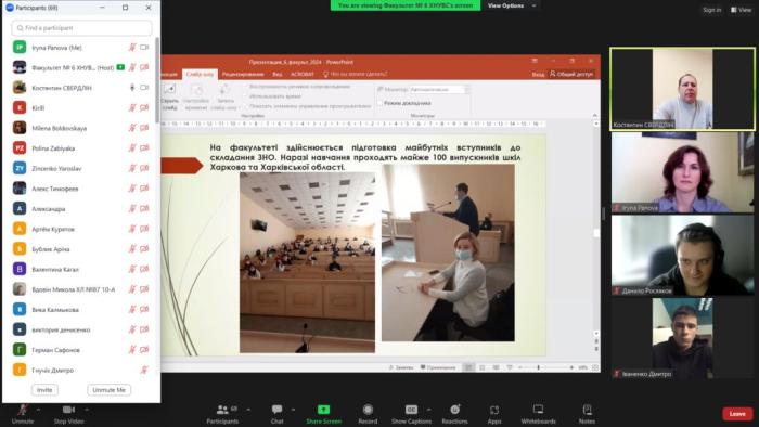 За сприяння управління освіти адміністрації Холодногірського району Харківської міської ради заступник декана факультету № 6 Костянтин Свердлін і завідувачка кафедри правоохоронної діяльності та поліціїстики Ірина Панова провели онлайн-зустріч на тему вступної кампанії 2024 року з керівництвом та учнями випускних класів низки закладів загальної середньої освіти Харківщини, серед них: Харківські гімназії №№ 67, 86, 136; Комунальні заклади «Харківські ліцеї» №№ 13, 18, 57, 69, 87, 108, 126, 152 Харківської міської ради.