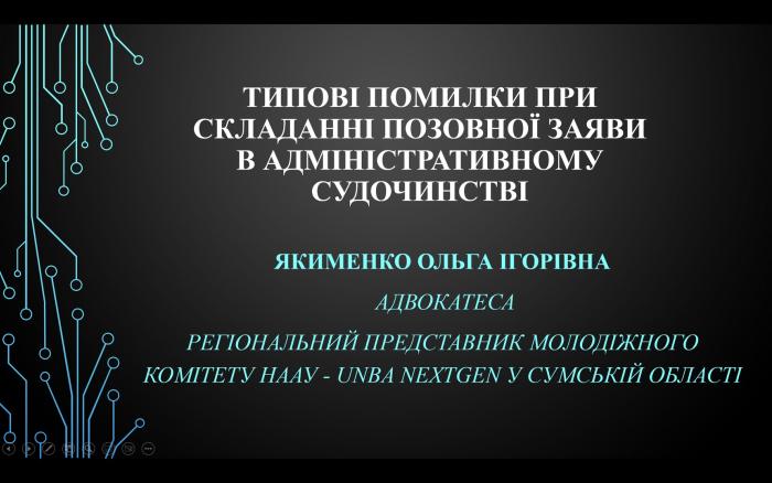 Доцентка кафедри юридичних дисциплін Сумської філії ХНУВС Олена Маркова спільно із адвокатом, регіональним представником молодіжного комітету НААУ – UNBA NextGen у Сумській області Ольгою Якименко провели бінарне практичне заняття на тему «Типові помилки при складанні адміністративного позову» для студентів 3 курсу, які навчаються за спеціальністю «Право». Разом із адвокатом здобувачі освіти працювали над позовом за фабулою про надання статусу біженця Державною міграційною службою.