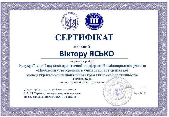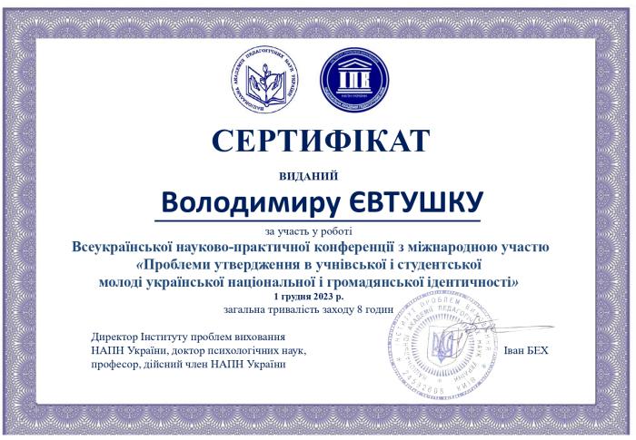 Науково-педагогічні працівники кафедри тактичної та спеціальної фізичної підготовки факультету № 3 Харківського національного університету внутрішніх справ – Сергій Кучинський, Володимир Євтушок і Віктор Ясько взяли участь у всеукраїнській науково-практичній конференції за темою «Проблеми утвердження в учнівської та студентської молоді української національної та громадянської ідентичності», що проходила в Інституті проблем виховання Національної академії педагогічних наук України.