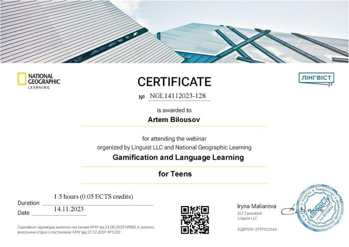Старший викладач кафедри Артем Білоусов ознайомився з поняттям «гейміфікація», використанням прийомів гейміфікації на заняттях, впровадженням ігрових елементів та використанням окремих елементів ігор у неігрових практиках на вебінарі «Gamification and Language Learning for Teens» від Linguist LLC and National Geographic Learning.