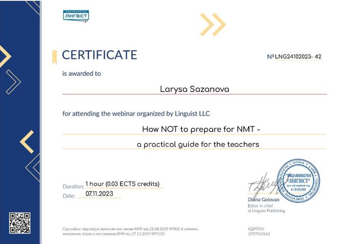 Старша викладачка цієї ж кафедри Лариса Сазанова відвідала Міжнародний онлайн-вебінар «How NOT to prepare for NMT – a practical guide for the teachers», організованому Linguistic LLC, на якому розглядалися структура та особливості проведення Національного мультипредметного тесту з англійської мови, а також корисні стратегії підготовки до НМТ та поради, що допоможуть спростити підготовку до тесту.