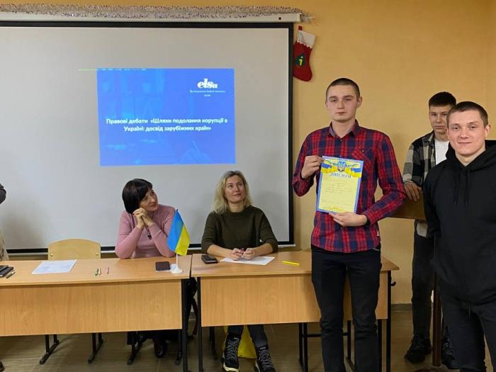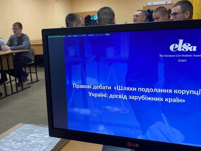 Учасники ELSASumy – здобувачі вищої освіти 1 та 2 курсів Сумської філії ХНУВС, які навчаються за спеціальностями «Право» та «Правоохоронна діяльність», організували та провели правові дебати. Кожна з команд, до яких увійшли студенти і курсанти, доводила свою позицію, наводячи аргументи та відшукуючи відповіді у вивченні політичних, правових та організаційних механізмів подолання корупції, які успішно діють в інших країнах. Проте команда студентів виявилася більш послідовною та переконливою, а тому здобула перемогу.