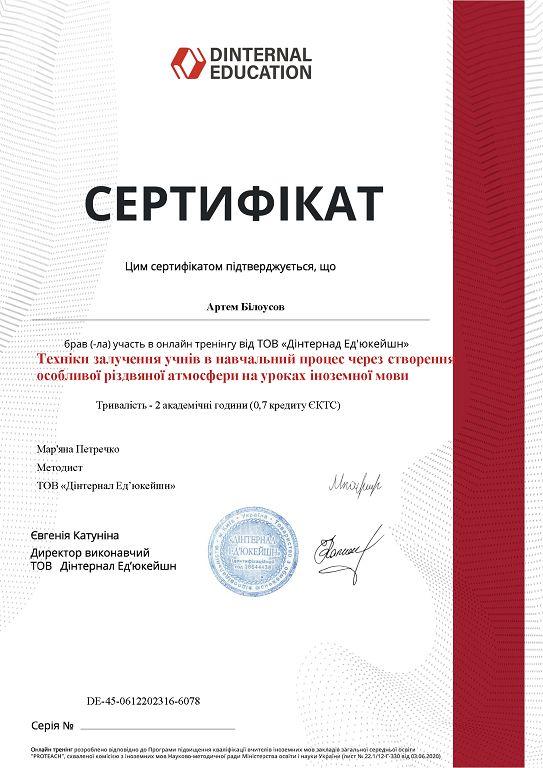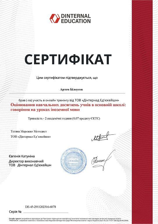 Старший викладач кафедри іноземних мов факультету № 4 Артем Білоусов відвідав два міжнародних онлайн-тренінги від Dinternal Education, де обговорювалося оцінювання навчальних досягнень (говоріння) на заняттях іноземної мови. Викладач ознайомився із вибором критеріїв оцінювання навичок говоріння (орієнтація на CEFR); організацією перевірки монологічного й діалогічного мовлення в офлайн і онлайн-форматі на різних рівнях володіння іноземною мовою; використанням елементів гейміфікації в оцінюванні навичок говоріння. Артем Білоусов закріпив навички підбирання варіантів перевірки говоріння залежно від формату викладання й рівня володіння мовою та користуватися сучасними онлайн-інструментами для організації перевірки в режимі онлайн.