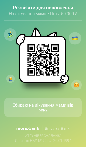 картка monobank: 4441 1144 5027 1489, або за посиланням https://send.monobank.ua/jar/2wN9MVMkqU, чи за допомогою qr-коду;
