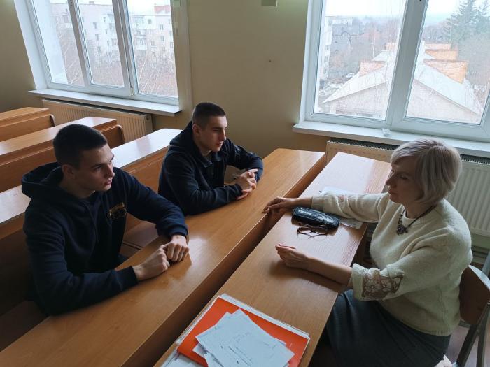 Доцентка кафедри українознавства, кураторка групи 201 факультету № 2 Вікторія Перцева провела індивідуальні бесіди з курсантами. Під час розмов курсанти поділились думками про свої настрої, інтереси й захоплення, про толерантне ставлення до одногрупників, про шкідливі звички й способи боротьби з ними, про дозвілля й стосунки в родинах тощо.