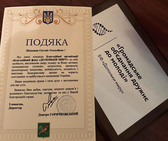 Команда громадської організації «Благодійний фонд ДОЛОНЬКИ МИРУ» м. Харків та її директор Дмитро Горячковський відзначили провідного наукового співробітника науково-дослідної лабораторії з проблем психологічного забезпечення правоохоронної діяльності Харківського національного університету внутрішніх справ Євгенію Гладкову. Представниця поліцейського вишу відзначена за її активну громадську позицію, патріотизм, проявлену волонтерську ініціативу та безкорисливу працю на користь сьогодення та майбутнього мешканців України. Така співпраця харків’ян та взаємодопомога сприяє досягненню миру й злагоди у суспільстві, є маленьким кроком до Перемоги, що в серці кожного з нас!