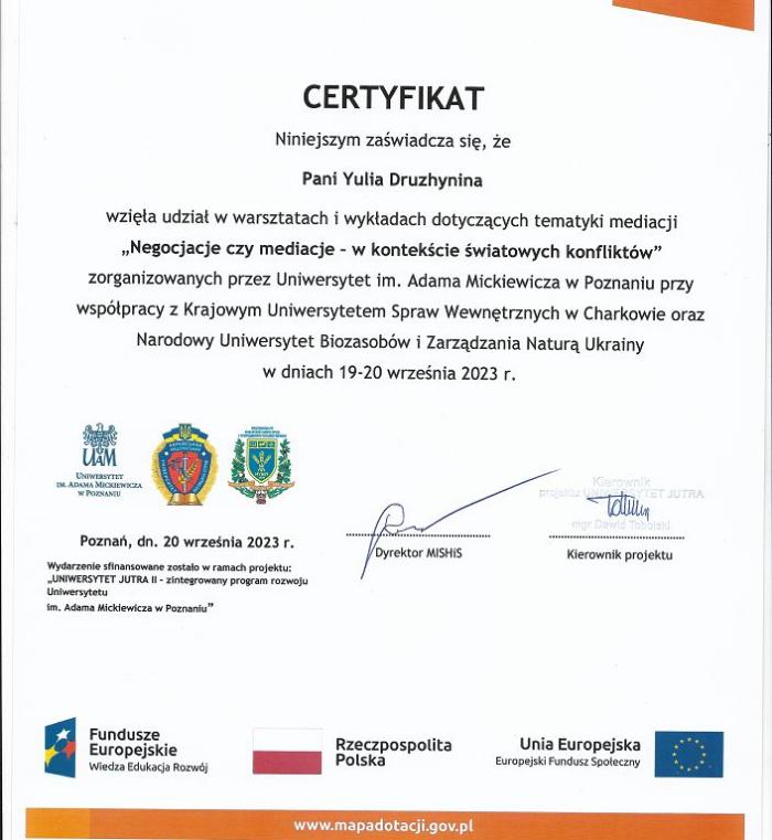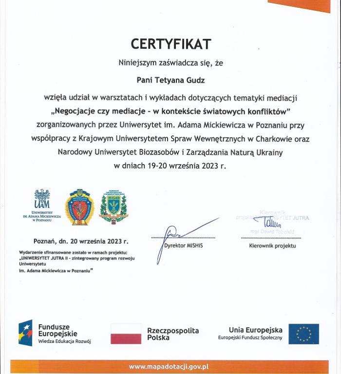 У межах реалізації програми академічної мобільності представниці факультету № 4 ХНУВС – завідувачка кафедри конституційного і міжнародного права Тетяна Гудзь та курсантка четвертого курсу Юлія Дружиніна – взяли участь у дидактичних заняттях із медіації, переговорів та арбітражу, зокрема міжнародного арбітражу під час воєнного стану. Захід проходив в університеті імені Адама Міцкевича (м. Познань, Республіка Польща) під час візиту делегації науковців і курсантів Харківського національного університету внутрішніх справ. Учасники обмінювалися досвідом, а також розглянули можливість використання медіації у війні росії проти України.
