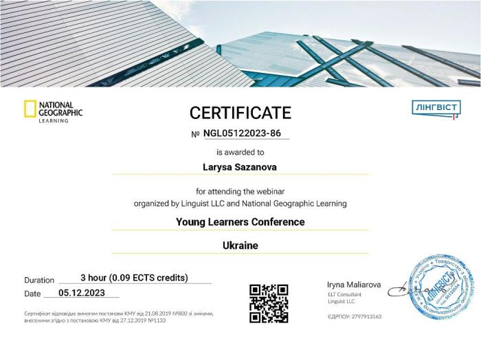 Старша викладачка кафедри іноземних мов факультету № 4 ХНУВС Лариса Сазанова відвідала онлайн-конференцію «Young Learners Conference Ukraine» від видавництва National Geographic Learning та компанії Лінгвіст. На заході розглядалися питання використання зображень для мотивації до вивчення іноземної мови, розвиток комунікативних та когнітивних навичок. Лариса Сазанова також ознайомилася із цифровими інструментами та ресурсами, які доступні для викладачів і студентів на платформі Spark, а також із використанням і перевагами проєктного навчання.