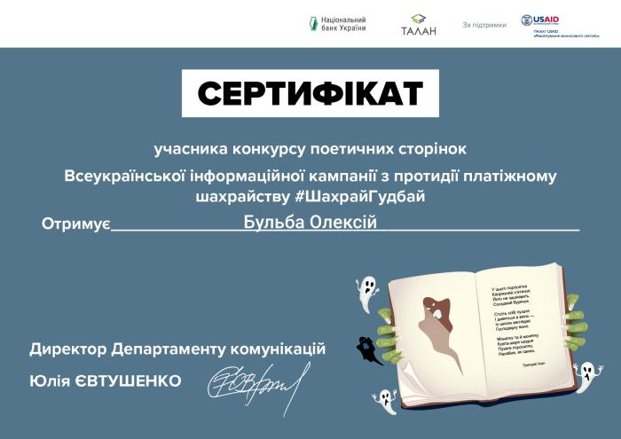 Команда студентів факультету № 6 Харківського національного університету внутрішніх справ, до складу якої ввійшли Владислав Батіщев і Олексій Бульба, на чолі з ментором доценткою кафедри соціально-гуманітарних дисциплін Наталією Кобилко взяла участь у конкурсі поетичних сторінок з платіжної безпеки. Захід організований Національним банком України в межах Всеукраїнської інформаційної кампанії з протидії платіжному шахрайству #ШахрайГудбай. На сьогодні питання платіжної безпеки є надзвичайно актуальним, адже з’являються нові види шахрайства в мережі Інтернет. Команда університету представила креативно оформлену поетичну сторінку з рекомендаціями щодо платіжної безпеки. Студенти у віршованій формі описали шахраїв у віртуальному просторі та надали поради, як від них уберегтися. За результатами конкурсу команда отримала іменні сертифікати.
