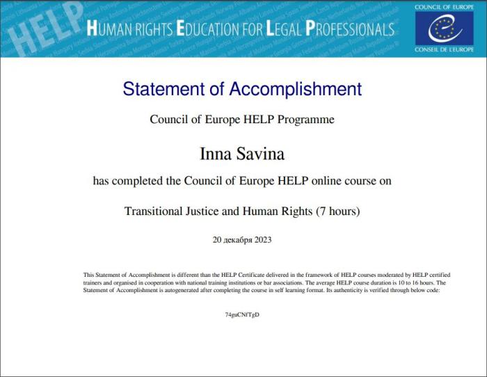 Актуальна інформація про курси, доступні для вивчення на платформі електронного навчання в області прав людини «HELP» від Офісу Ради Європи доступна в межах групи, створеної відділом міжнародного співробітництва у застосунку Телеграм для координації навчання, надання консультацій з питань реєстрації та проходження курсів на платформі «HELP». Усі бажаючі можуть долучитися до групи за посиланням: https://t.me/+JUliLHndzJM4NDcy