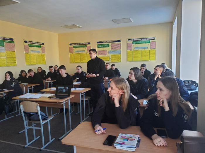 Курсанти ознайомилися з термінологією за темою заняття, відпрацювали мовний матеріал та виконали тренувальні вправи. Віталій Карпінський обговорив із майбутніми слідчими структуру і характер професійної діяльності фахівця, основні завдання МВС України щодо протидії злочинності, підтримання громадського порядку та громадської безпеки, охорони, захисту прав і свобод людини, інтересів суспільства і держави.