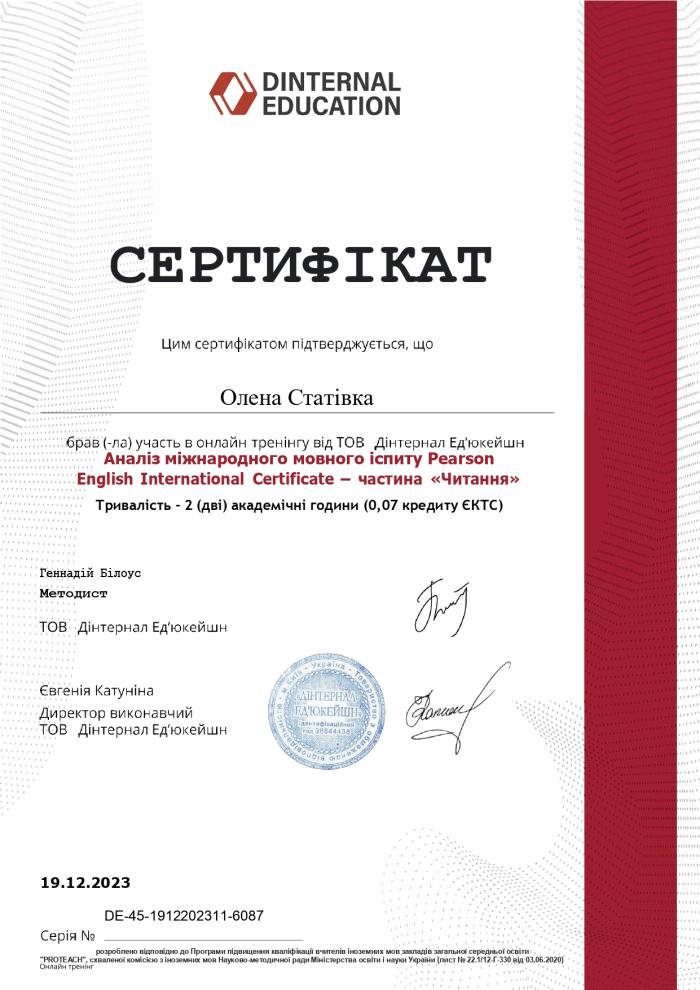 Завідувачка кафедри іноземних мов факультету № 4 ХНУВС Олена Статівка взяла участь у міжнародних онлайн-тренінгах: «Аналіз міжнародного мовного іспиту Pearson English International Certificate – частина «Аудіювання» та «Аналіз міжнародного мовного іспиту Pearson English International Certificate – частина «Читання» від Dinternal Education. Учасники розглянули питання міжнародної сертифікації з англійської мови як засобу об’єктивної перевірки та підтвердження рівня володіння мовою. Олена Статівка ознайомилася з міжнародними критеріями оцінювання аудіювання та читання, прикладами та поясненнями, типами завдань в іспиті PEIC та стратегіями їх успішного виконання.