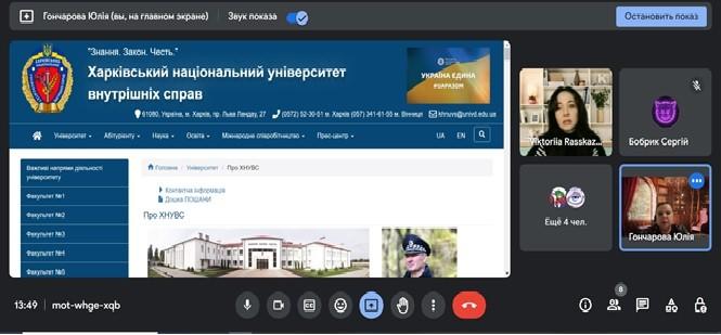 У межах профорієнтаційної роботи старший викладач кафедри цивільного права та процесу факультету № 6 Вікторія Рассказова провела онлайн-зустріч з учнями старших класів та педагогічними працівниками Комунального закладу «Безлюдівський юридичний ліцей імені І.Я.Підкопая Безлюдівської селищної ради. Під час заходу вона ознайомила з умовами вступу до Харківського національного університету внутрішніх справ, розповіла про факультети та спеціальності, за якими здійснюється підготовка фахівців, відповіла на запитання учнів.