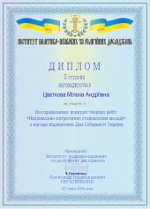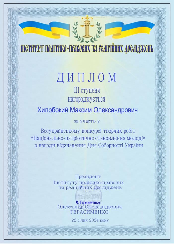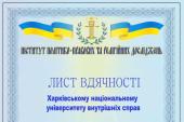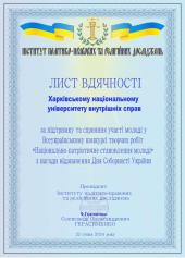Від оргкомітету Всеукраїнського конкурсу нагороди отримали: Диплом ІІ ступеня – курсантка факультету № 2 Мілена Цвєткова (керівник – завідувач кафедри українознавства факультету № 2 доктор філологічних наук, професор Ігор Чорний) і Диплом ІІІ ступеня – курсант факультету № 1 Максим Хилобокий (керівниця – старша викладачка кафедри українознавства факультету № 2 Наталія Єльнікова). Інститут політико-правових та релігійних досліджень надіслав Подяку Харківському національному університету внутрішніх справ за підтримку та сприяння участі молоді у конкурсі.