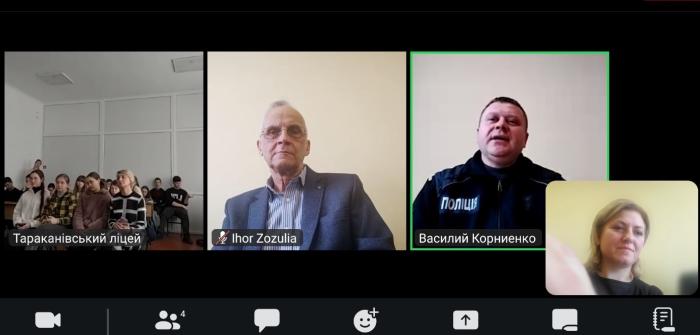 Працівники кафедри криміналістики, судової експертології та домедичної підготовки факультету № 1 Харківського національного університету внутрішніх справ у складі завідуючого кафедри Василя Корнієнка, професора Ігоря Зозулі та старшої викладачки Юлії Іншекової провели профорієнтаційну бесіду у режимі відеоконференції з учнями 9-11-х класів Тараканівського ліцею Тараканівської сільської ради Дубенського району Рівненської області. Під час бесіди учням надали загальну інформацію про університет, факультети та спеціальності, за якими готують фахівців у ХНУВС, умови вступу до вишу та можливість електронної реєстрації кандидатів на навчання через портал Національної поліції: osvita.np.gov.ua
