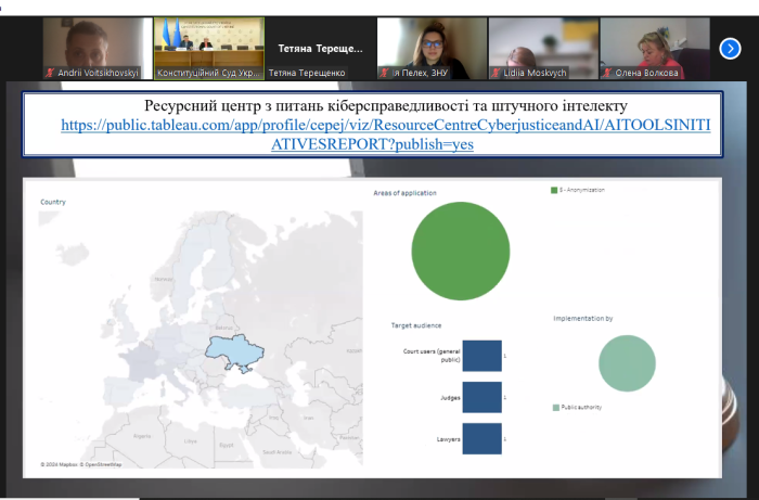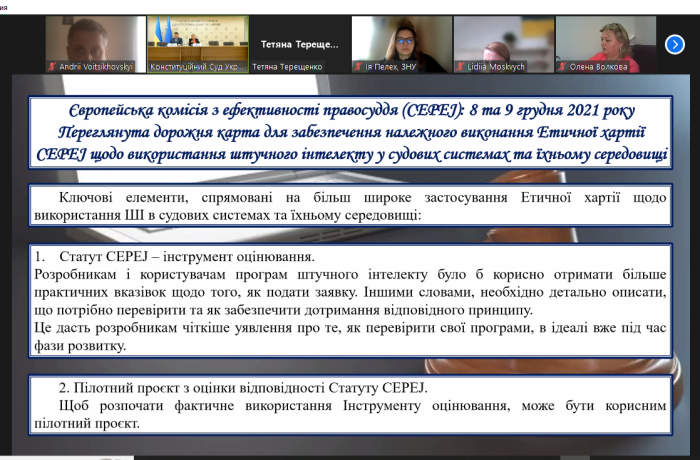 Судді також розповіли про основні положення Європейської етичної хартії Європейської комісії з питань ефективності правосуддя (CEPEJ) Ради Європи щодо використання штучного інтелекту в судових системах та їхньому середовищі 2018 року, законопроєкту Європейського Союзу «Про штучний інтелект» 2023 року, Розпорядження Кабінету Міністрів України «Про схвалення Концепції розвитку штучного інтелекту в Україні» від 02 грудня 2020 року № 1556-р. та інші.