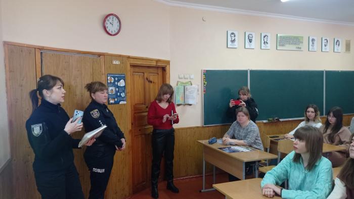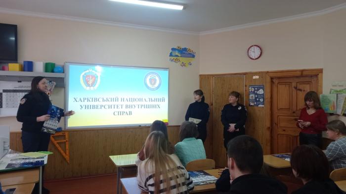 Під час зустрічі школярі переглянули відео про Харківський поліцейський виш та отримали інформаційні буклети з контактною інформацією, куди звертатись у разі виникнення додаткових запитань.