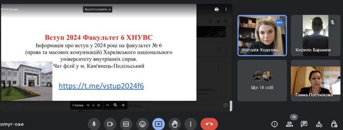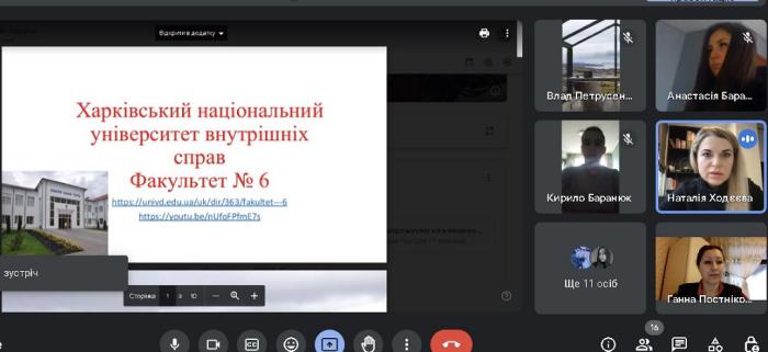Доцентка кафедри цивільного права та процесу факультету № 6 Харківського національного університету внутрішніх справ Наталія Ходєєва за сприянням директорки Первомайського ліцею «Ерудит» Первомайської міської ради Миколаївської області Наталії Пташинської та учительки ліцею Ганни Постнікової провела онлайн-зустрічі з майбутніми випускниками ліцею. Старшокласники переглянули відеофільм про Харківський національний університет внутрішніх справ, ознайомилися з особливостями вступу і навчання у виші у 2024 році та отримали контактну інформацію для звернень у разі виникнення додаткових запитань.