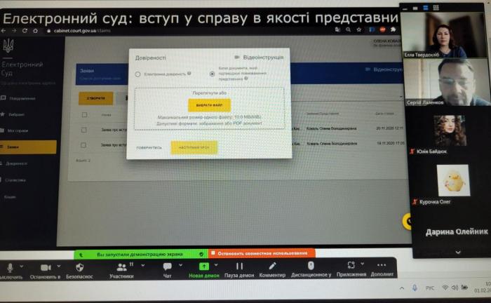 Доцентка кафедри цивільного права та процесу факультету № 6 Харківського національного університету внутрішніх справ Елла Твердохліб та адвокат Сергій Лалєнков провели бінарне заняття з дисципліни «Цивільний процес» за темою «Судова влада і правосуддя в цивільних справах» для студентів 3 курсу денної форми навчання факультету № 6. Під час лекції розглянули питання процесуальної форми та форми захисту, стадії цивільного процесу. Сергій Лалєнков розповів про особливості фунціонування єдиної судової інформаційно-телекомунікаційної системи та продемонстрував порядок користування електронним кабінетом на платформі «Електронний суд».