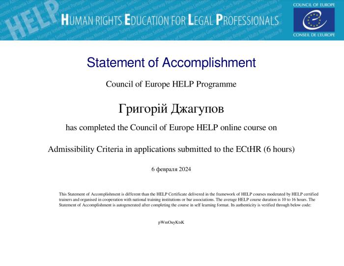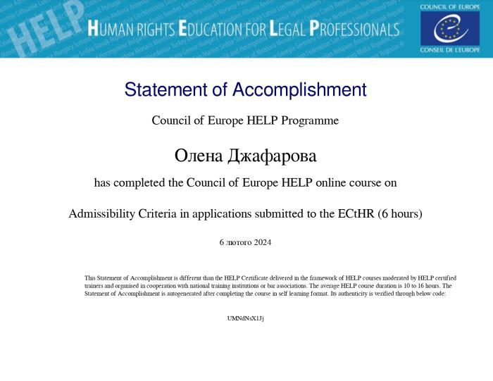 Декан факультету № 3 Геннадій Звірянський, його заступник з навчально-методичної роботи Григорій Джагупов, завідувачка кафедри поліцейської діяльності та публічного адміністрування Олена Джафарова, слухач магістратури факультету № 3 Данііл Зінченко та завідувач науково-дослідної лабораторії з проблем досудового розслідування Сергій Шатрава успішно пройшли онлайн-курс Ради Європи HELP з питань критеріїв допустимості в поданнях до Європейського суду з прав людини (ECtHR). Ця частина програми HELP (Human Rights Education for Legal Professionals) спрямована на підвищення обізнаності та кваліфікації юристів, суддів, прокурорів та інших правозахисників у сфері прав людини у Європі.