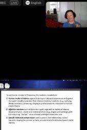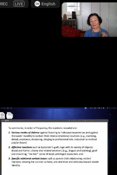 Під час вебінару засновниця і виконавча директорка Міжнародного центру з вивчення, профілактики та лікування успадкованих травм поколінь, клінічний психолог, травматолог, віктимолог і психоісторик, доктор Яель Даніелі презентувала ґрунтовне дослідження щодо довготривалості наслідків травматичних подій, пасивної та активної провини, різновидів поведінки терапевтів, сорому та інших емоцій, що супроводжують тих, що вижив. Окрему увагу доповідачка приділила наслідкам минулих травматичних подій на врятовані сім’ї, зокрема батьків, які вижили, та їх нащадків й відзначила спільність об’єкту її досліджень як з війною в Україні, так і будь-якого світового конфлікту своєю етноцентричністю, тобто поглядом на світ через призму етнічної ідентифікації, оцінки життєвих і культурних процесів через традиції етнічної самосвідомості.