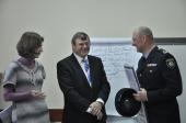Перед початком тренінгу з учасниками заходу поспілкувалися ректор університету генерал поліції третього рангу Валерій Сокуренко та перший проректор університету підполковник поліції Дмитро Швець.