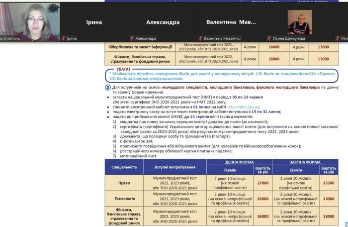 Наприкінці семінару Олена Шахова ознайомила учасників з основними умовами вступу до Харківського національного університету внутрішніх справ. Вона розповіла про переваги навчання у закладі вищої освіти зі специфічними умовами навчання, про факультети та спеціальності, за якими готують фахівців, а також приділили особливу увагу умовам вступу та навчання на факультеті № 6.