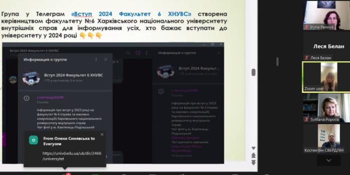 Відбулася профорієнтаційна зустріч із старшокласниками, яку провели декан факультету Оксана Брусакова, заступник декана Костянтин Свердлін, завідувачка кафедри правоохоронної діяльності та поліціїстики Ірина Панова, професорки Світлана Попова та Олена Синявська. У заході взяли участь понад 90 учнів, яким було роз’яснено особливості навчання у Харківському національному університеті внутрішніх справ, зокрема на факультеті № 6. Представники поліцейського вишу також надали рекомендації щодо підготовки до вступу на навчання. На всі запитання старшокласники отримали вичерпні відповіді.