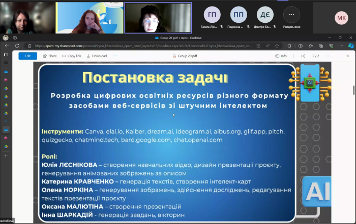 Учасники проєкту набули практичного досвіду комунікації у цифровому середовищі Microsoft Teams, підвищили рівень професійної та цифрової компетентності під час застосування онлайн-сервісів зі штучним інтелектом в освітньому процесі.