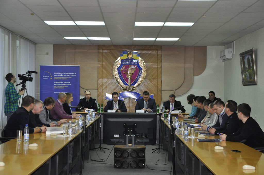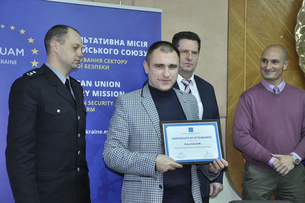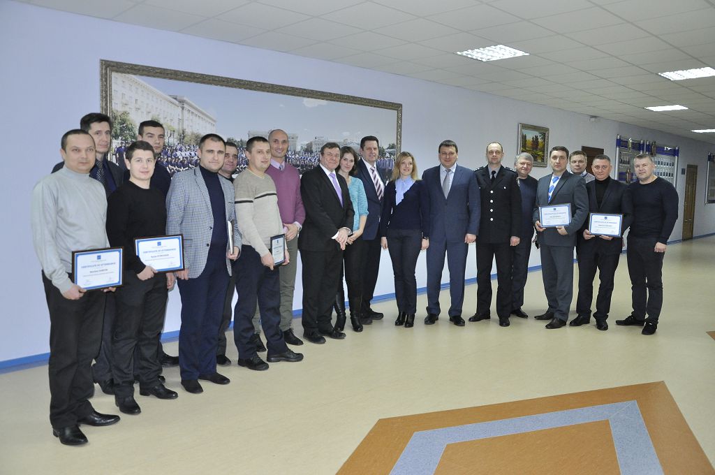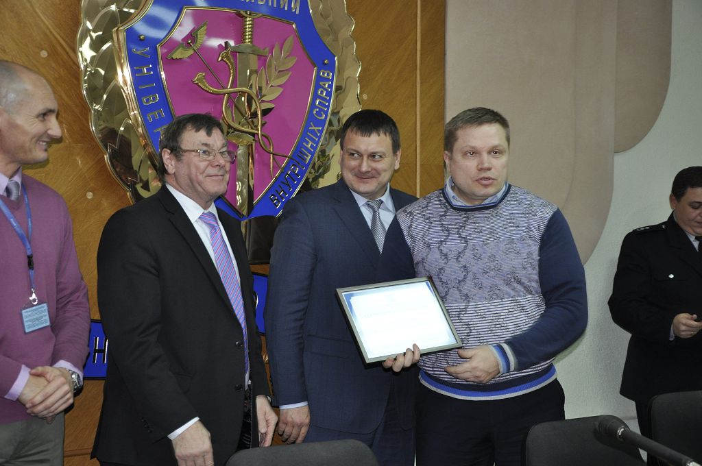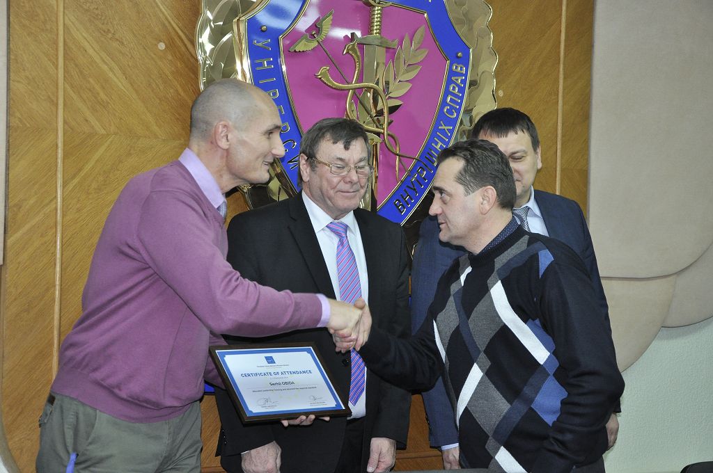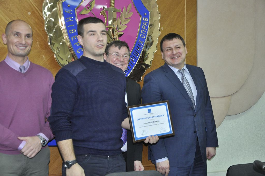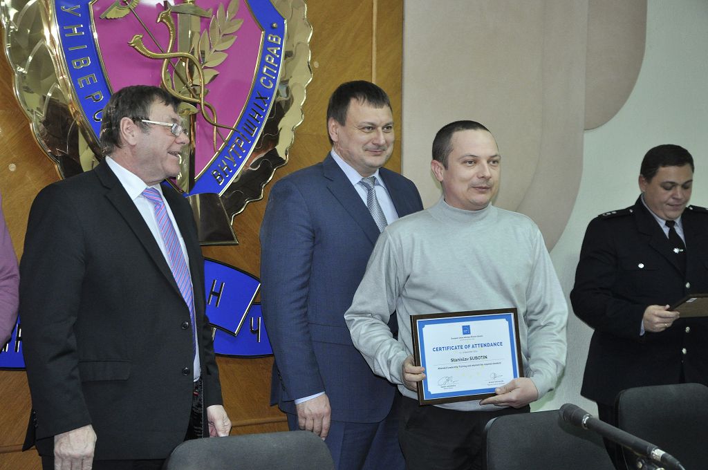 Сертифікати про завершення тренінгу вручили начальник ГУНП в Харківській області генерал поліції третього рангу Анатолій Дмитрієв, перший проректор університету підполковник поліції Дмитро Швець, голова відділу регіональних питань КМЄС Удо Моллер.