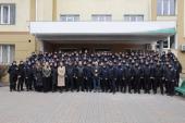 З напутніми словами до поліцейських офіцерів громад звернувся ректор університету Валерій Сокуренко: «Сьогодні знаменна подія у вашому житті. Ви випускаєтесь напередодні другої річниці вторгнення на нашу землю російського ворога. І це ще раз підкреслює, що, незважаючи на військовий стан, держава знайшла можливість продовжувати надзвичайно важливу реформу Національної поліції України. Ми вдячні нашим партнерам, які надають нам доступ до нових найкращих практик, методик, надбань, які є у світовій поліціїстиці. І той факт, що нас ними озброюють, робить нас більш потужними, швидшими, стійкішими. Сьогодні є багато викликів для нашого суспільства і держави. Ви – складова Сил Безпеки та Оборони. Переконаний, що ви будете справжніми, нестимете службу віддано, керуватиметеся словами Присяги, яку склали на вірність Українському народові, і ті знання й уміння, що отримали, застосуєте на практиці. Надзвичайно важлива місія у вас – захищати, дбати про громадян, надавати їм кваліфіковану допомогу, у тому числі й гуманітарну. Служіть і працюйте так, щоб вас поважали люди й оберігав Господь Бог! Слава Україні!».